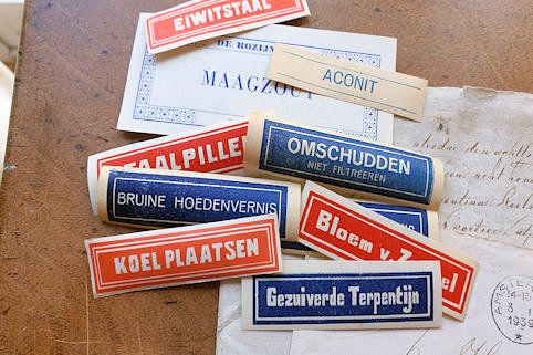Prachtig mooie set van 10 oude Hollandsche apothekers/drogisterij etiketten Art.nr OPL26