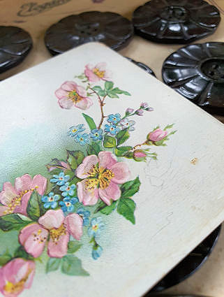 met vergeet me nietjes en victoriaanse dame in houten krat.