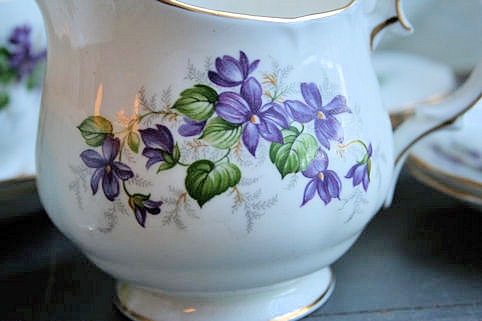 Schitterend 8 delig Engels Paas/voorjaars theeservies van Duchess Bone China met Maarts Viooltje Art.nr S294